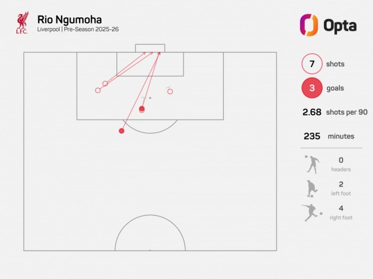 当然,真正让恩古莫哈火出圈的,还是今夏利物浦的季前赛。他在5场比赛中贡献5球(3球2助攻),无论是面对横滨水手,还是面对米兰、毕尔巴鄂竞技这样的球队,恩古莫哈不管是左路内切,还是中路突破,亦或者关键时刻的一锤定音,都展现出了超越年龄的冷静与成熟。